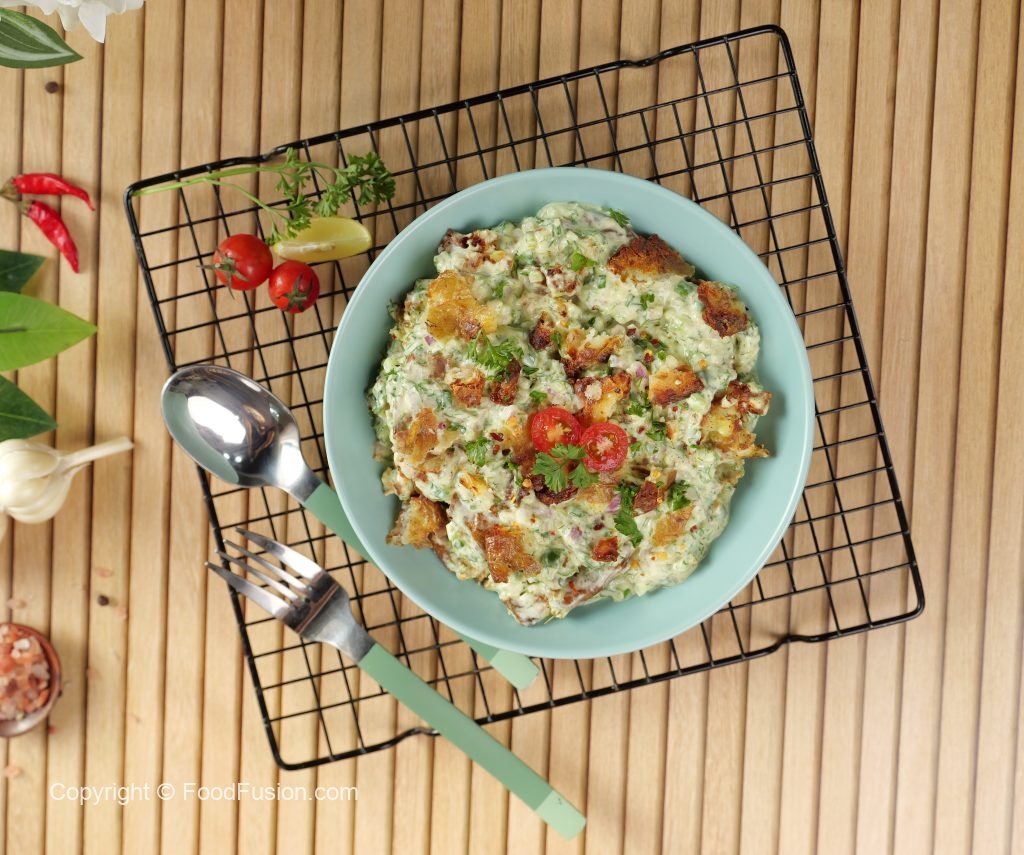 -Air fried potatoes ko crush ker ka salad bowl mein dal dein aur mix ker lein.