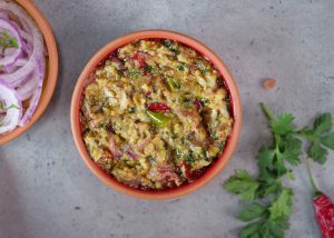 -In mortal & pestle,add cooked mixture,fresh coriander & crush coarsely.