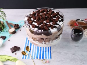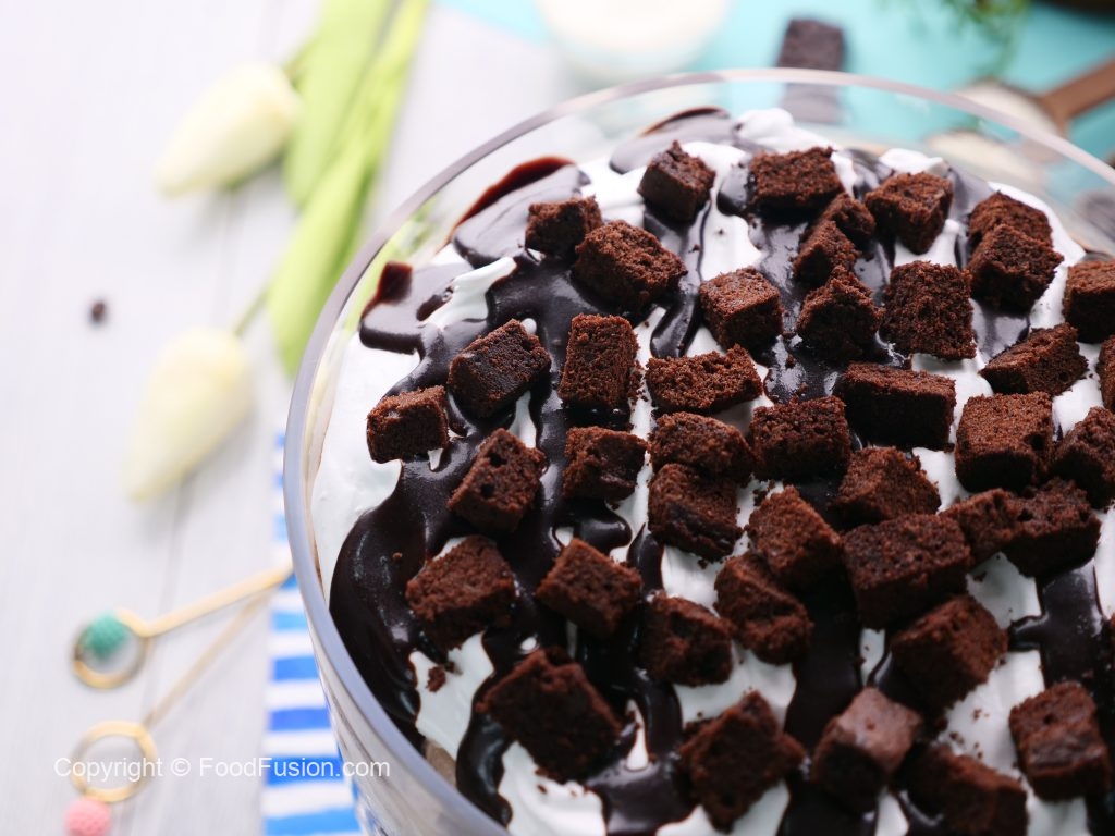 -Add prepared hot fudge sauce,brownie pieces & brush prepared coffee mixture on brownie pieces.