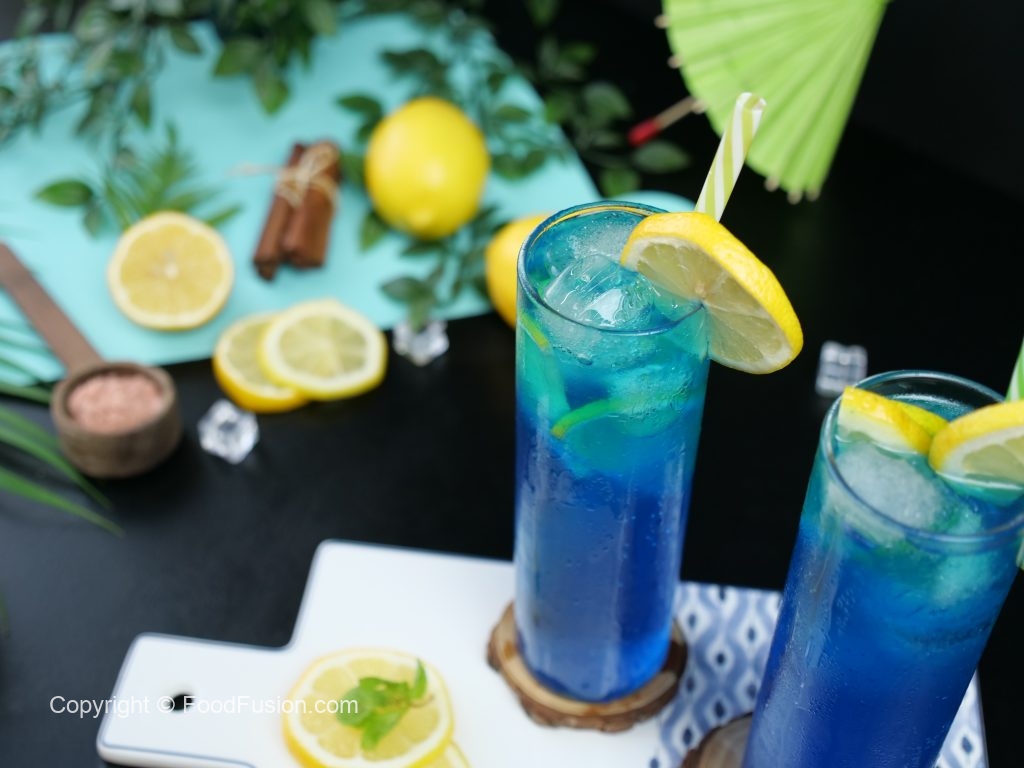 -In a serving glass,add ice cubes,lemon slices,7up,prepared blue curacao syrup (2 tbs) & stir well.