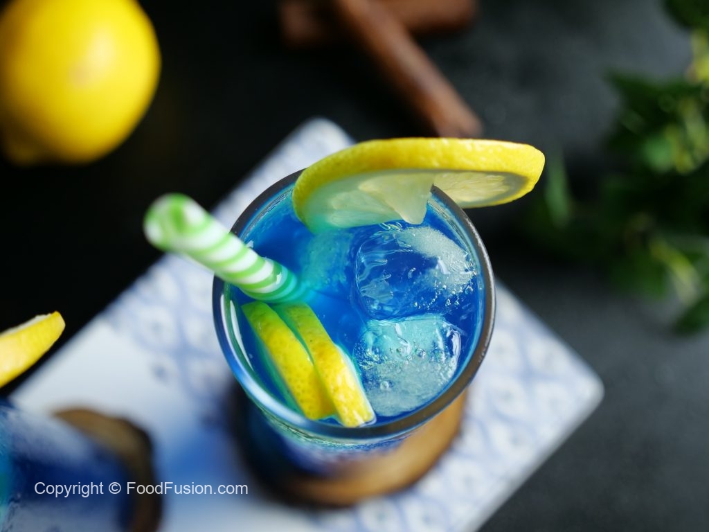 -Serving glass mein ice cubes,lemon slices,7up & tayyar blue curacao syrup (2 tbs) dal ker ache tarhan stir ker lein.