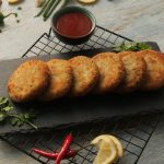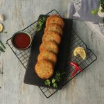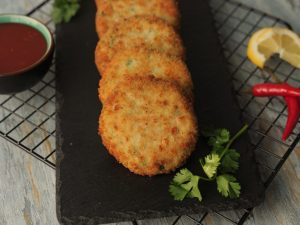 Grease hands with oil,take small quantity of mixture (approx. 50-55g) & make kababs of equal sizes then dip into whisked eggs & coat with breadcrumbs (makes 12-15).