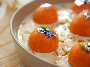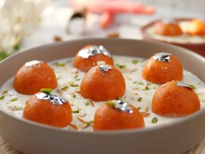 -In a serving dish, add prepared rabri doodh, prepared carrot jamun, garnish with edible silver leaf, pistachios, almonds & serve!
