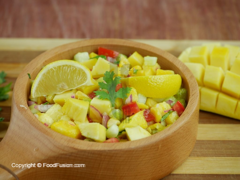 In bowl add mango cubes, cucumber cubes and tomato cubes, corn boiled and coriander leaves.