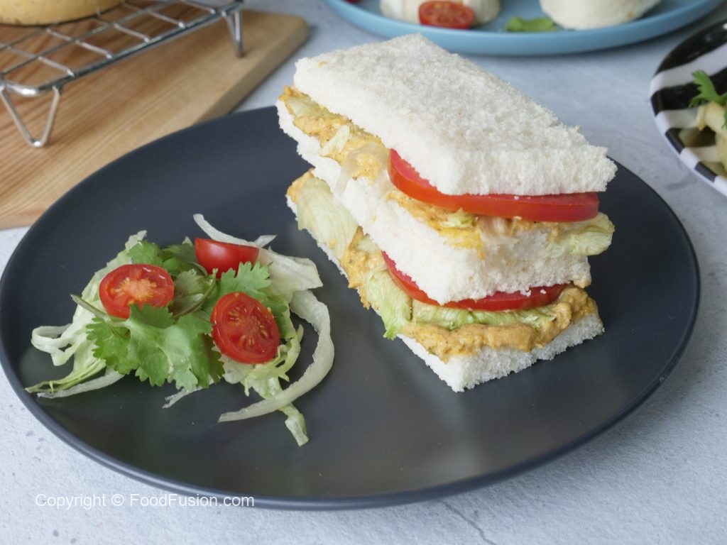 On bread slices,add & spread chicken tikka spread,iceburg,tomato slices and top with another bread slice,cut into pieces & serve!