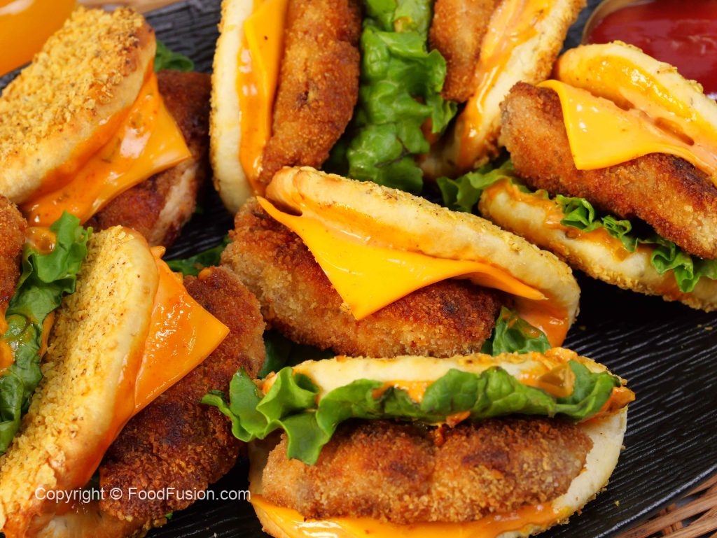 -On buns,add & spread prepared sauce, place salad leaf,crispy chicken,cheese slice,prepared sauce & serve (makes 14).