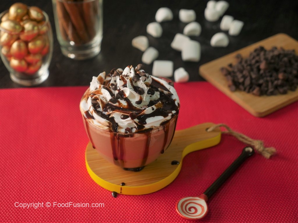 Serving cup mein nutella hot chocolate,whipped cream,chocolate chips,chocolate syrup aur cocoa powder dal ker serve karein.