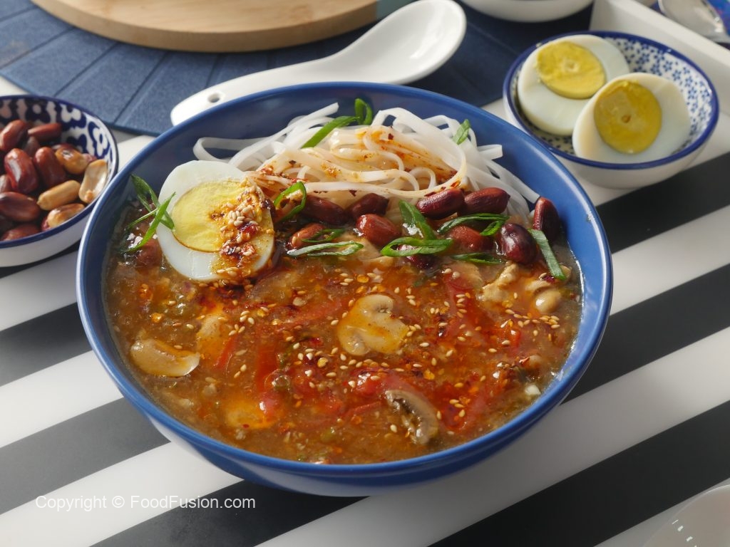 In serving bowl,add rice noodles,hot and sour soup,fried peanuts,green onion leaves,boiled egg,chilli oil,green onion leaves & serve!