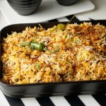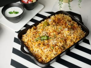 Add fried onion,boiled rice,fried onion,fresh coriander,mint leaves,green chilli,orange food color,kewra water and ghee,cover & steam cook on low flame for 8-10 minutes.