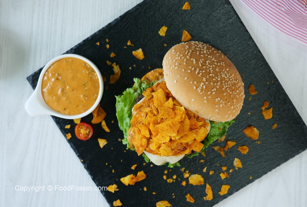 -On a burger bun,add & spread prepared fusion burger sauce,add salad leaves,burger patty with cheese, tomato slice,burger patty with cheese,fusion burger sauce,spicy chips (coarsely crush with hands) & serve with french fries (makes 3 burgers).