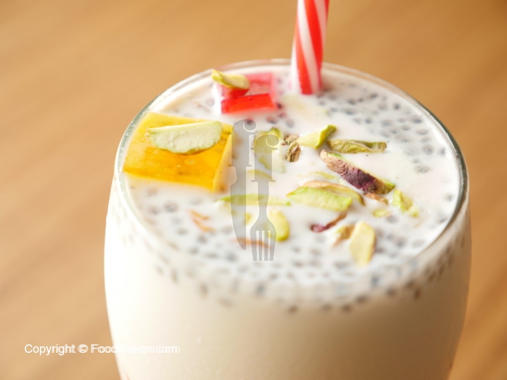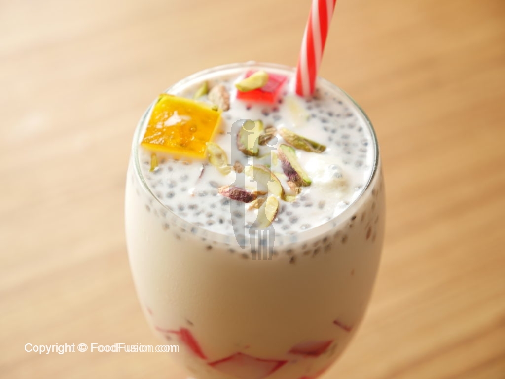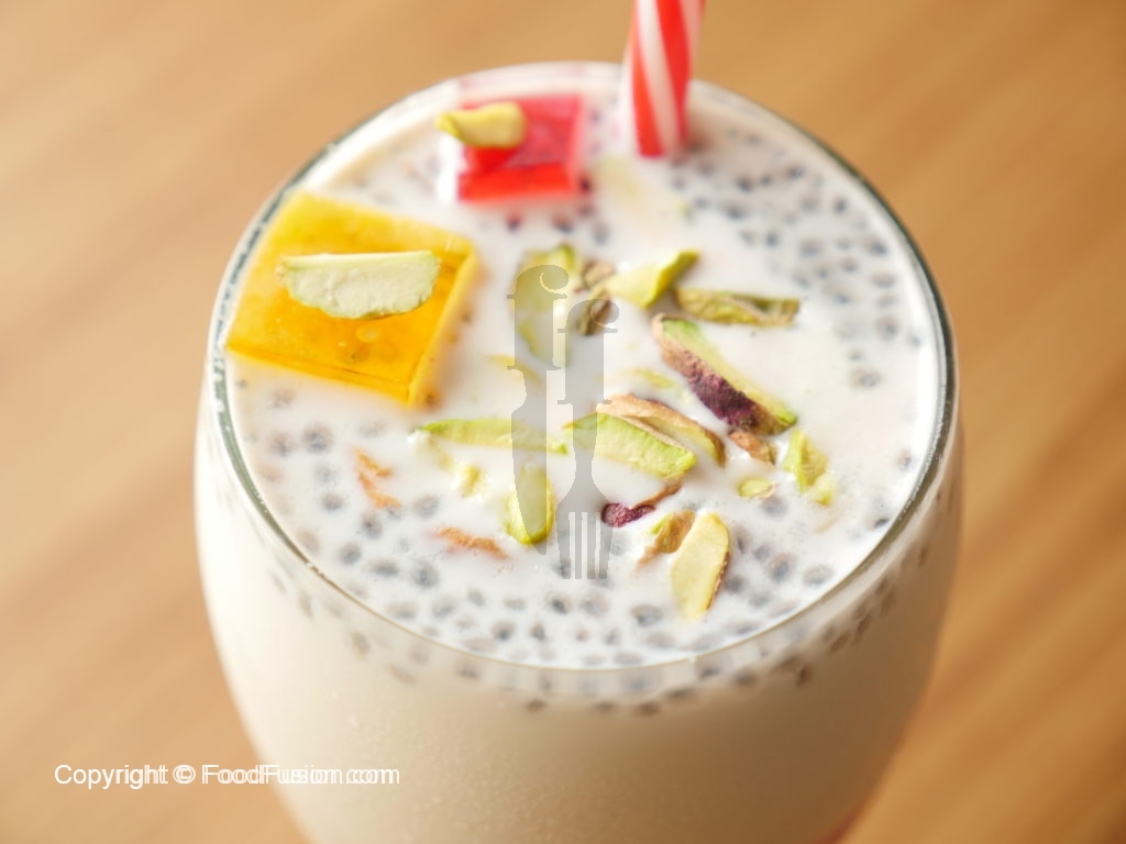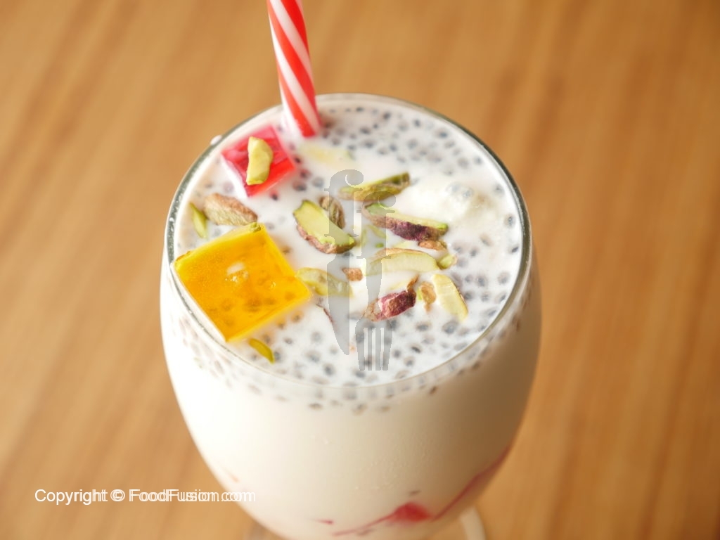 On serving glass,add colored jelly cubes,falooda sev,drizzle rose syrup,basil seeds,kulfa slices, pistachio, chilled thick milk and garnish with dry fruit & serve.
