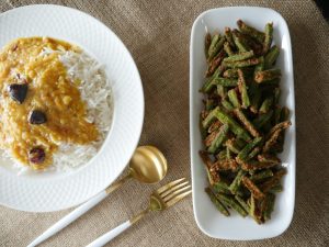 Bhindi ko dho ker pat dry karein aur vertically 4 pieces mein cut ker lein.
