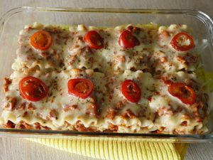 Baking dish mein red sauce with mince dal ker pheela lein.