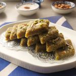 Cut in pieces, garnish with pistachios & almonds.