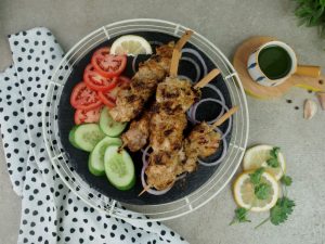 Marinated chicken ko wooden skewers per laga lein (makes 9-10).