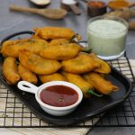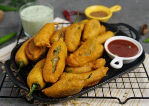 -Cut mirchi pakora from center and place them on a serving plate. Add green lentil gram in it.