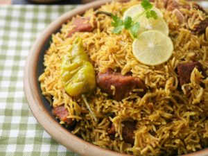 Add dissolve food color,fried onion,cover & steam cook on low flame for 10-12 minutes & serve!