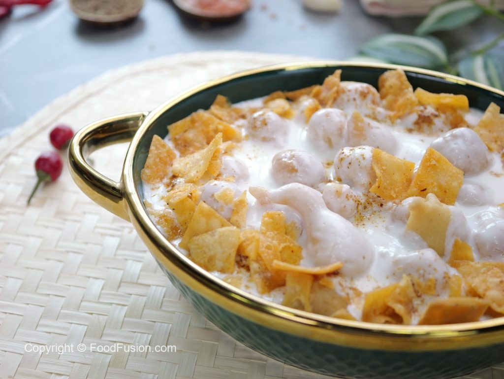 -In a serving dish,add soaked phulki,prepared meethi dahi,sprinkle chaat masala,garnish with papri & serve!