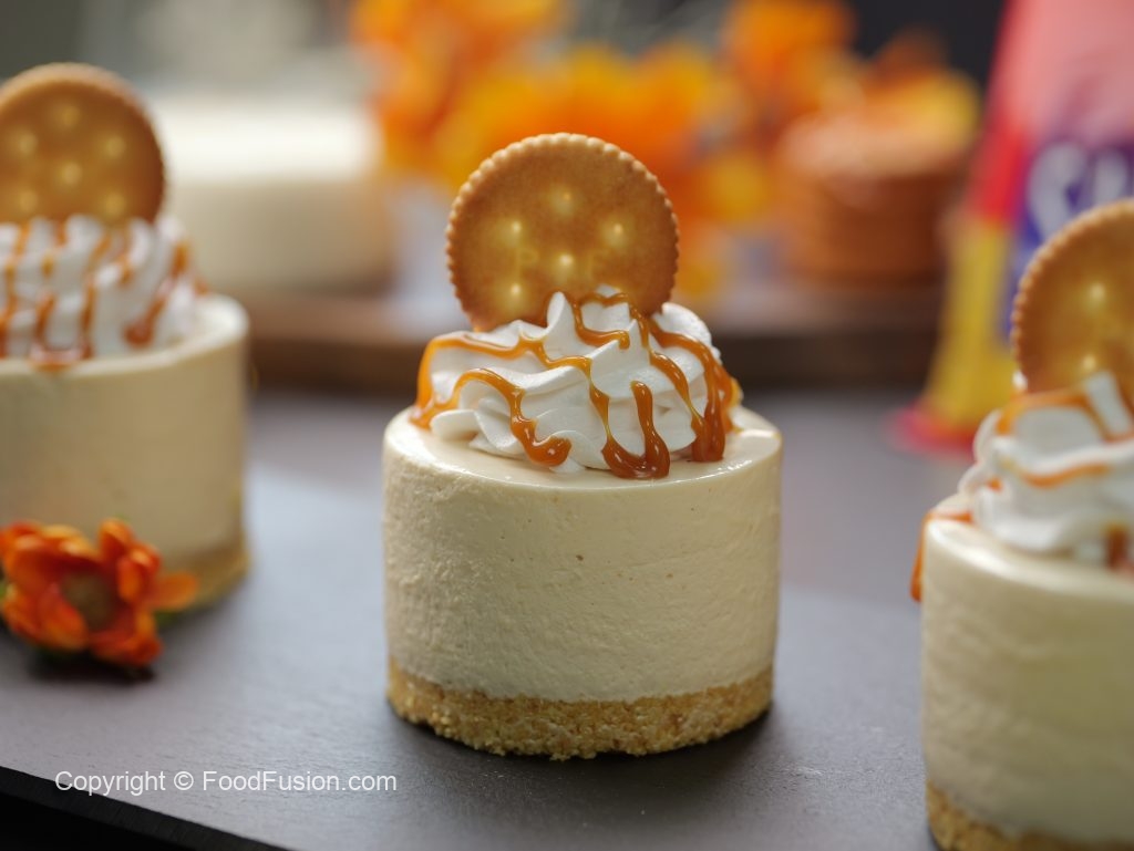 -Take out mini cheese cakes from molds,garnish with whipped cream,drizzle salted caramel sauce & saltish biscuit & serve (makes 4-5).