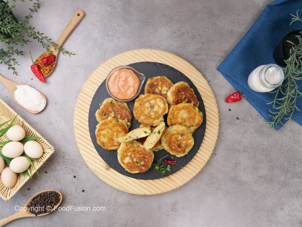-In a frying pan,heat cooking oil,pipe out prepared mixture & flatten with the help of greased spoon & fry pancakes from both sides on low flame until golden brown.