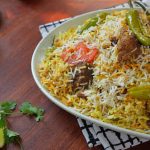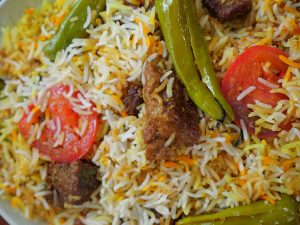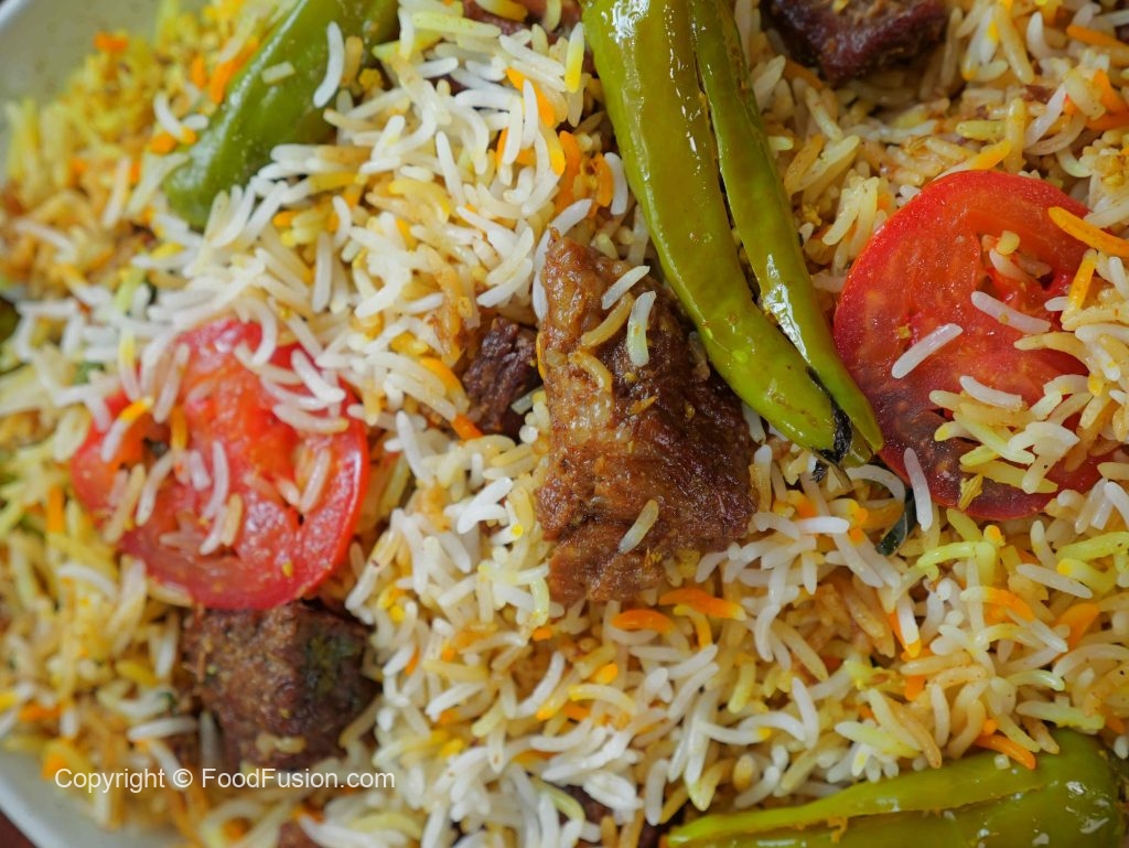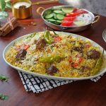 -Remove the cover of beef, mix well, add tomato slices, fresh coriander, mint leaves, half of boiled rice, prepared dahi mirch, half of leftover boiled rice, tomato slices, saffron essence, orange food color, & clarified butter.