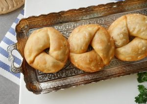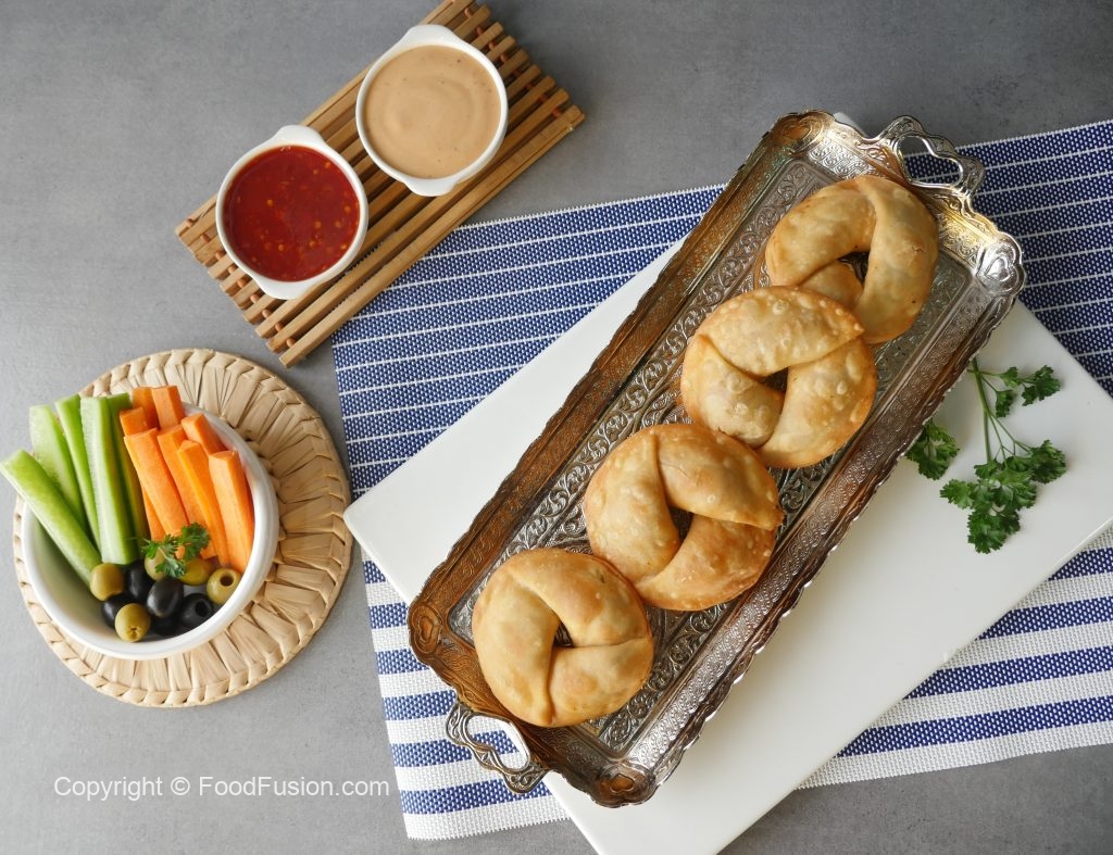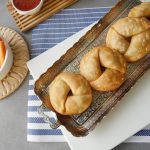 Take three small dough,add prepared chicken filling,prepared potato filling,prepared mozzarella cheese,apply water,fold & seal properly.