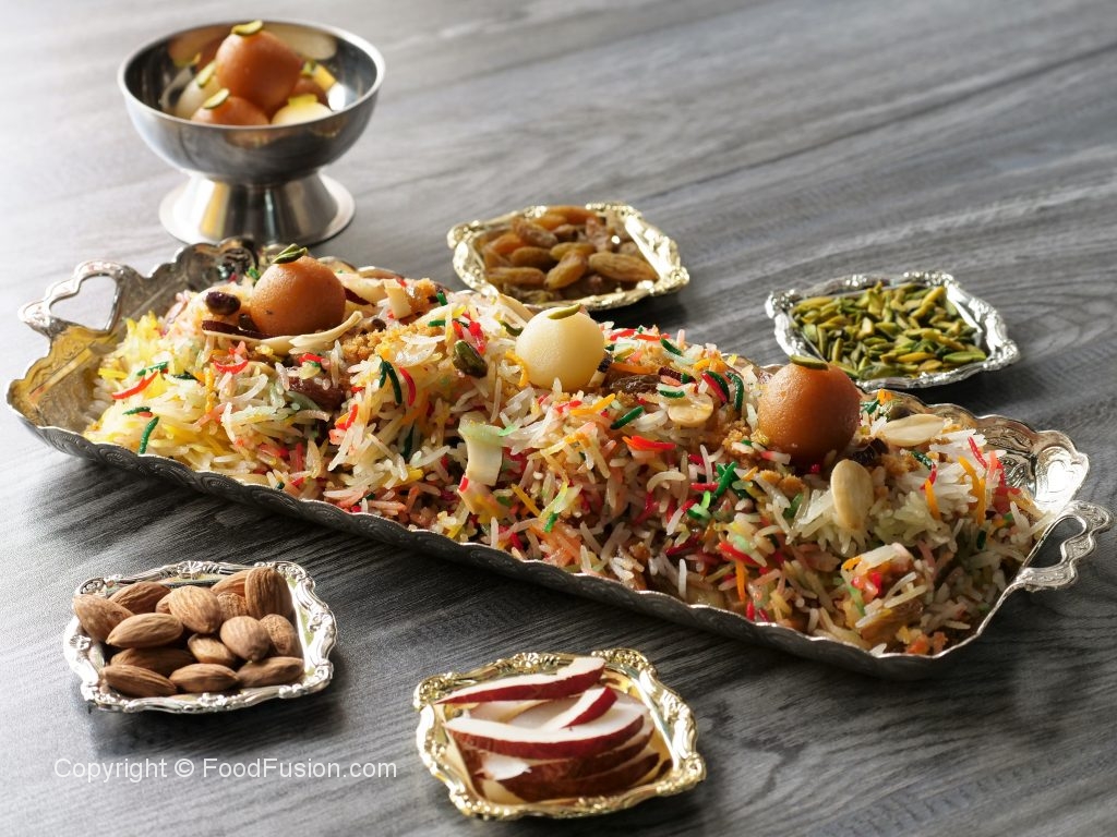 Fried khoya,green colored chawal,red colored chawal aur yellow colored chawal dal dein.
