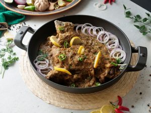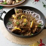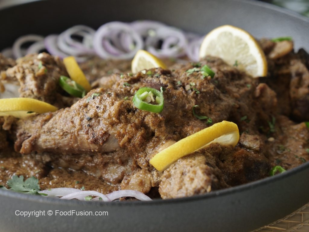 Add fried mutton leg/dasti & pour gravy,cover & cook on low flame until tender (1 & ½ hour ),rotate & flip in between.