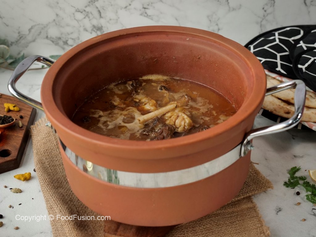 Mutton paya mein namak,badi elaichi,laung,sabut kali mirch,darchini,tez patta,adrak lehsan paste ayr garam pani dal ker ache tarhan mix karein aur ubal anay ka bad dhak dein aur halki ancch per gul janay tak paka lein (2-3 hours).