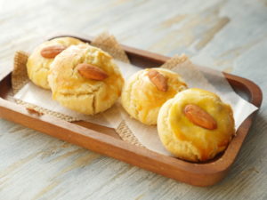 On baking plate/tray,place butter paper and nan khatai balls,egg yolk wash and place roasted almond on top.