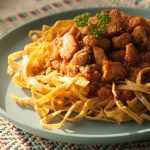 -Serving plate mein tayyar egg noodles,marinara sauce aur cooked chicken dal ker serve karein!