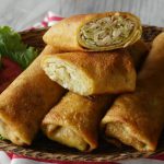 Take a prepared wrap,add chicken & cabbage filling,fold over the sides,roll up and apply all-purpose flour paste.
