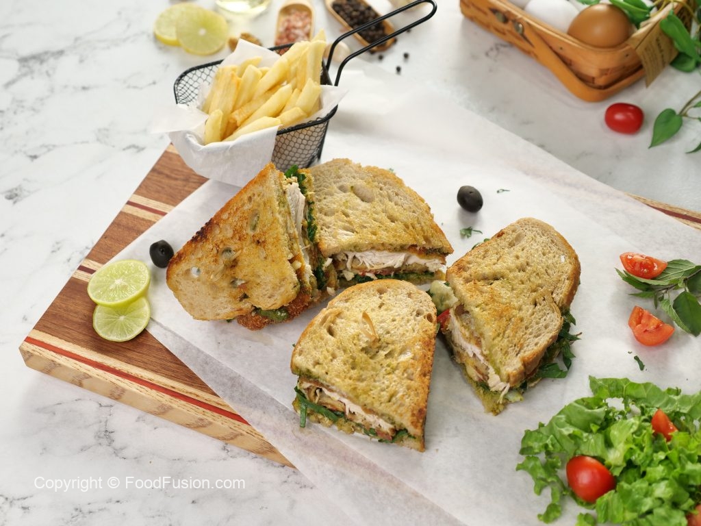 -On bread slice,add & spread prepared pesto sauce,add baby spinach,tomato slices,cheddar & mozzarella cheese,chicken fillet,cheddar & mozzarella cheese,pesto sauce & cover with another bread slice & grill for a minute until cheese melts (makes 3).