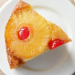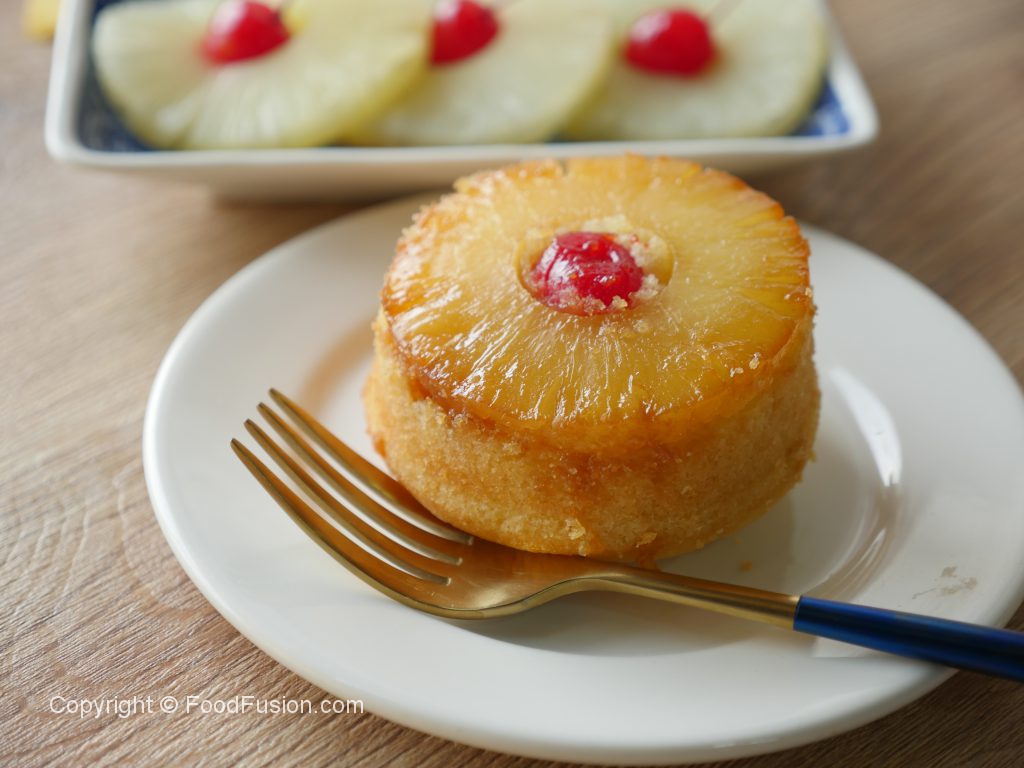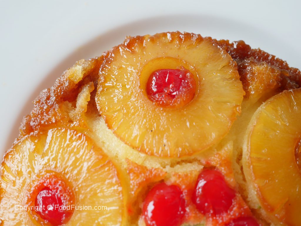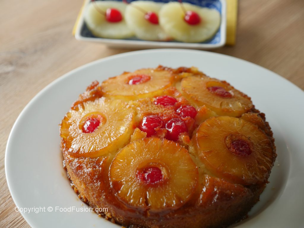 8 x 8 inch baking pan mein cooked sugar syrup dal ker pineapple rings aur cherries rakh dein aur tayyar batter pour ker lein.