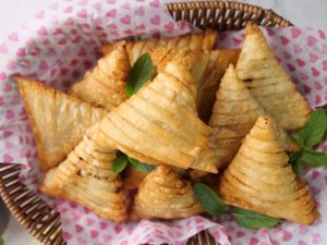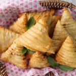 -Apply flour slurry,make a pocket,add mince filling in the centre & roll into the shape of samosa and seal corners with all-purpose flour slurry (makes 12-14).