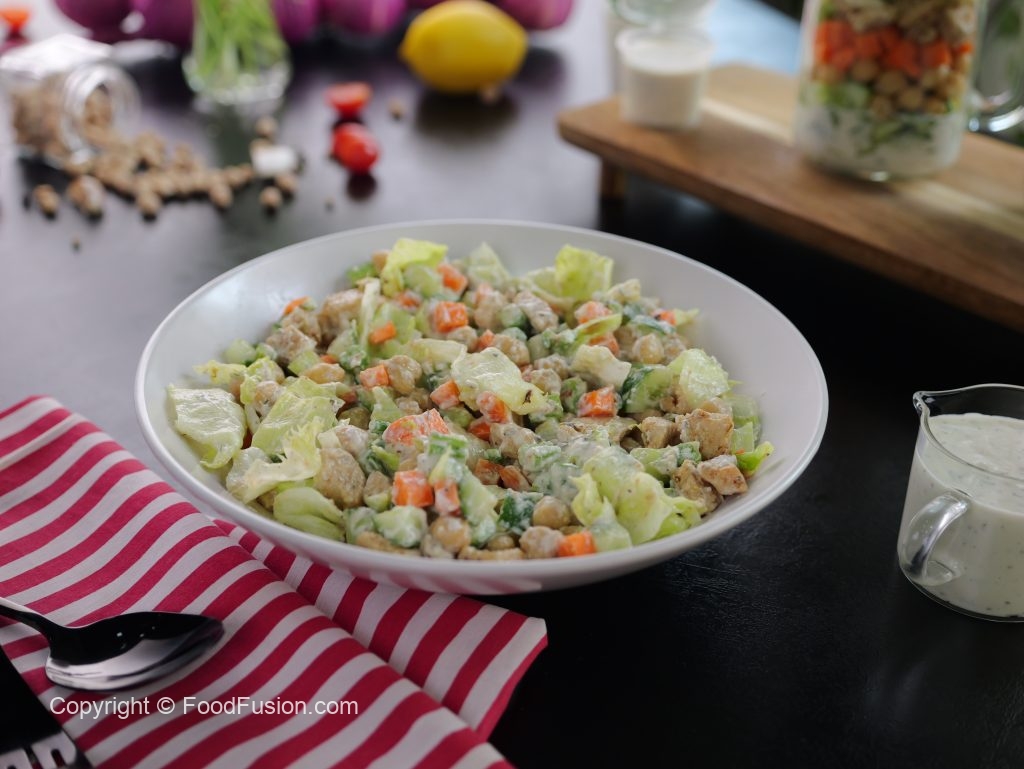 -In a mason jar,add prepared ranch dressing,cucumber,chickpeas,carrot,celery,cooked chicken, iceberg & cover with lid.