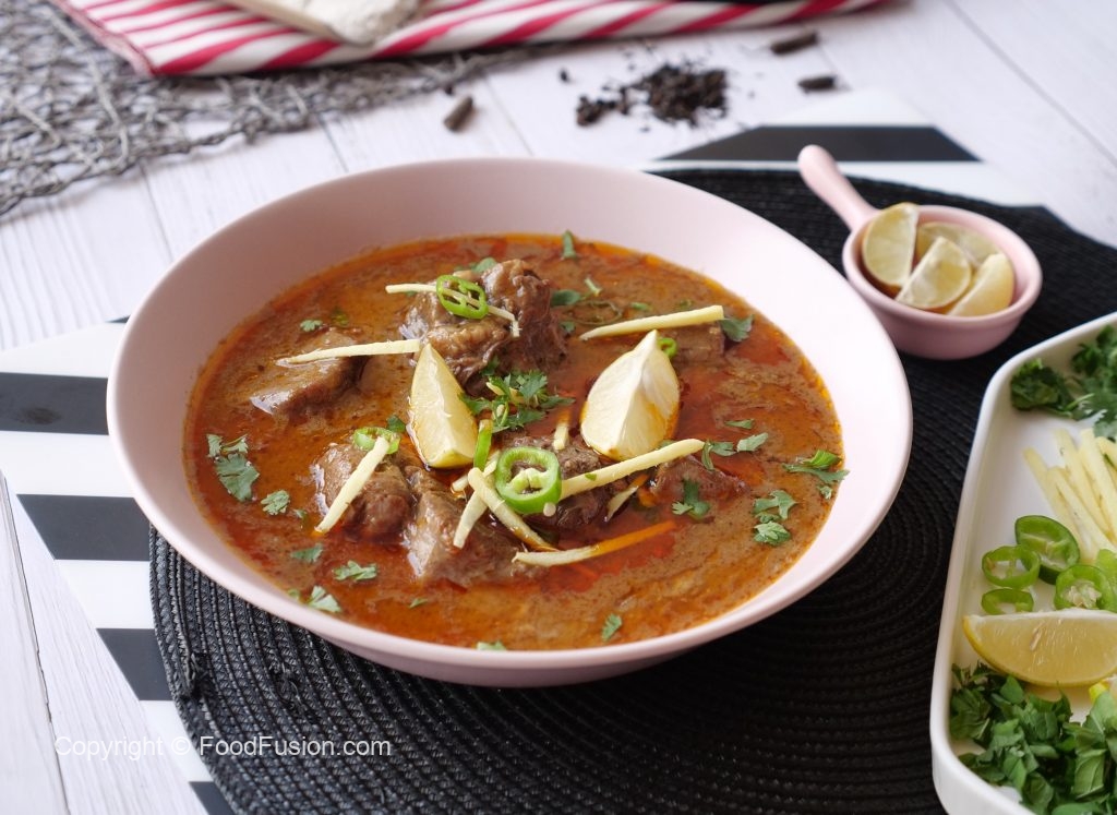 Serving dish mein nihari,chilli oil (tarri),adrak,hari micrhein,hara dhania aur lemon dal ker serve karein!