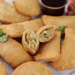 -Pani laga lein aur rolled dough ko filling ka upper dal dein phir round cutter ki madad sa half-moon cut ker lein & edges ko gently press ker ka seal ker lein.