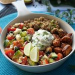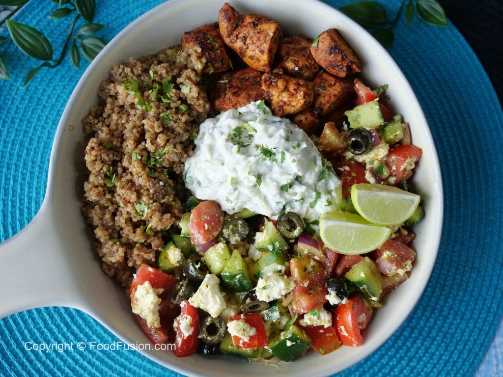 On a serving dish,add quinoa,greek salad,prepared chicken & tzatziki sauce.