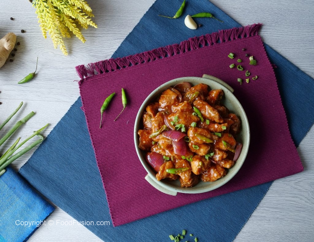 In a wok,heat cooking oil,fry marinated chicken on medium flame until golden brown.