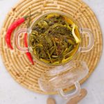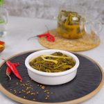 -In a jar, add boiled mustard leaves, green garlic, pink salt, red chilli powder, turmeric powder, mustard seeds, cover & shake until well combined.