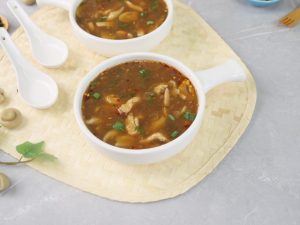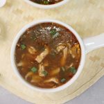 -In serving bowl,add red chilli crushed,soy sauce,sesame oil,soup,green onion leaves & serve!