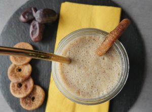 In blender,add soaked figs+dates+milk,ice cubes and blend until well combined.