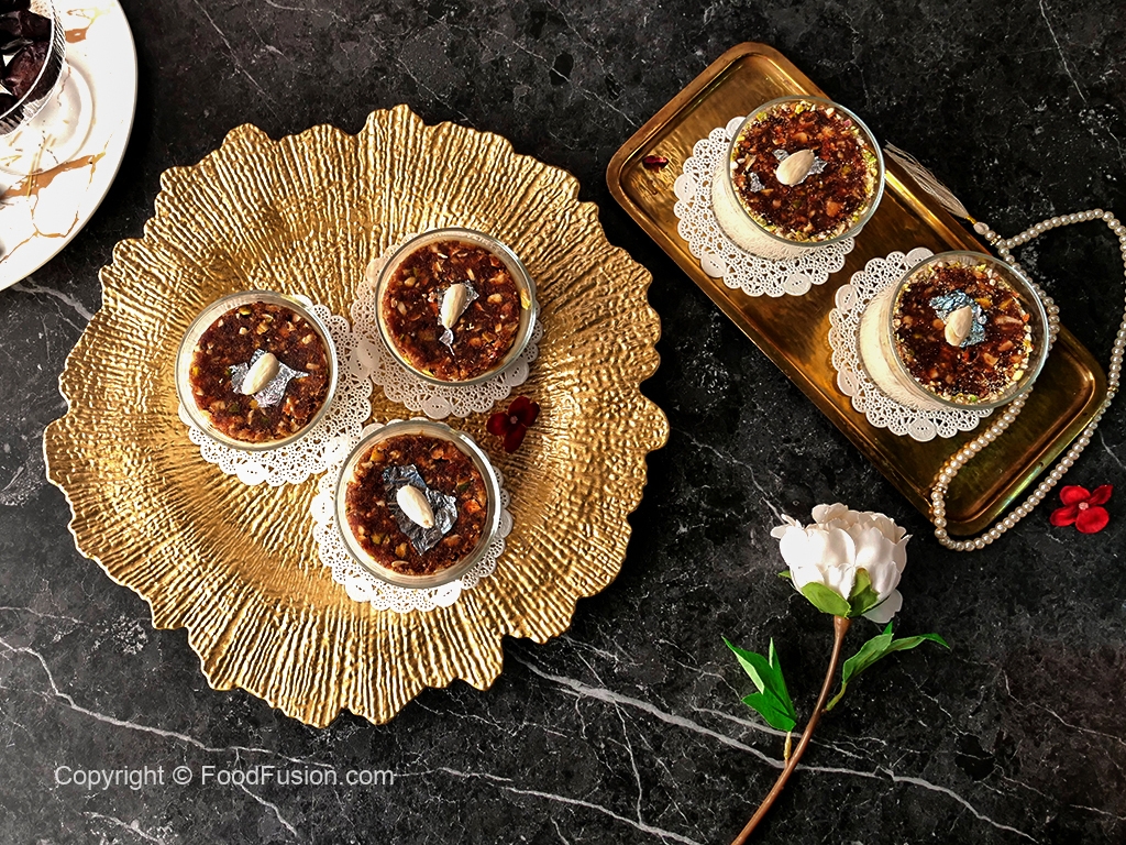 In a serving glass,add prepared sheer khurma then carefully place prepared date mousse disc over it.