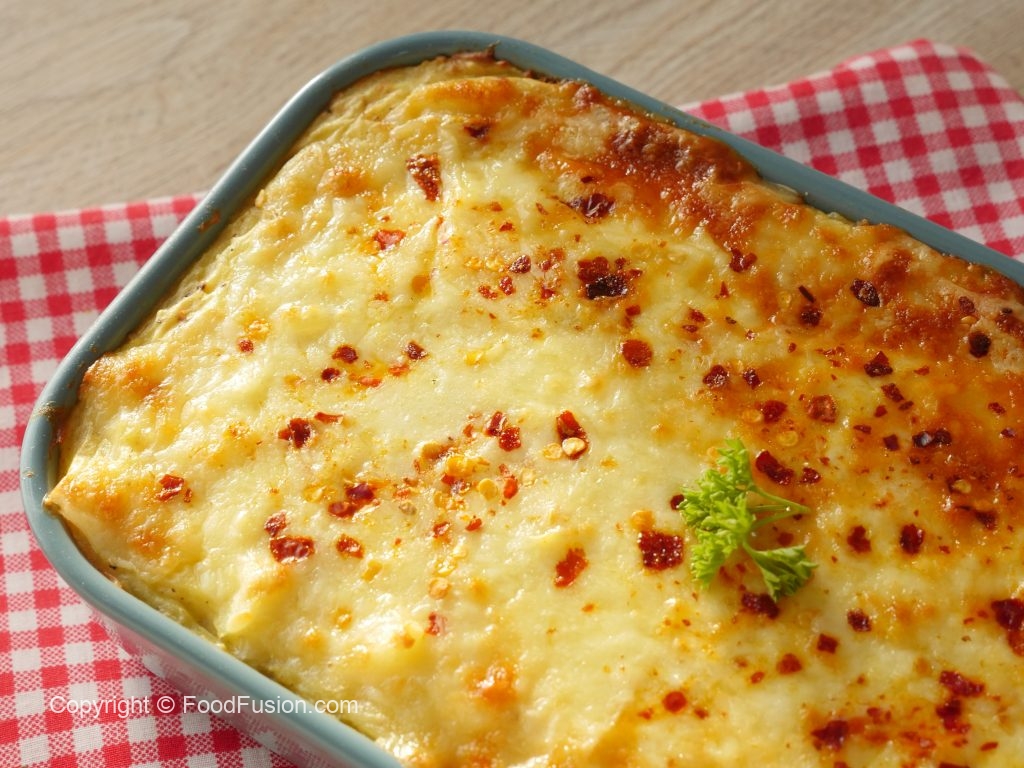 potatoes,cheddar cheese and mozzarella cheese and sprinkle red chili crushed.