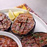 -Cut eggplant into half,make vertically & horizontally cuts & sprinkle prepared spice mix (reserve for later use).