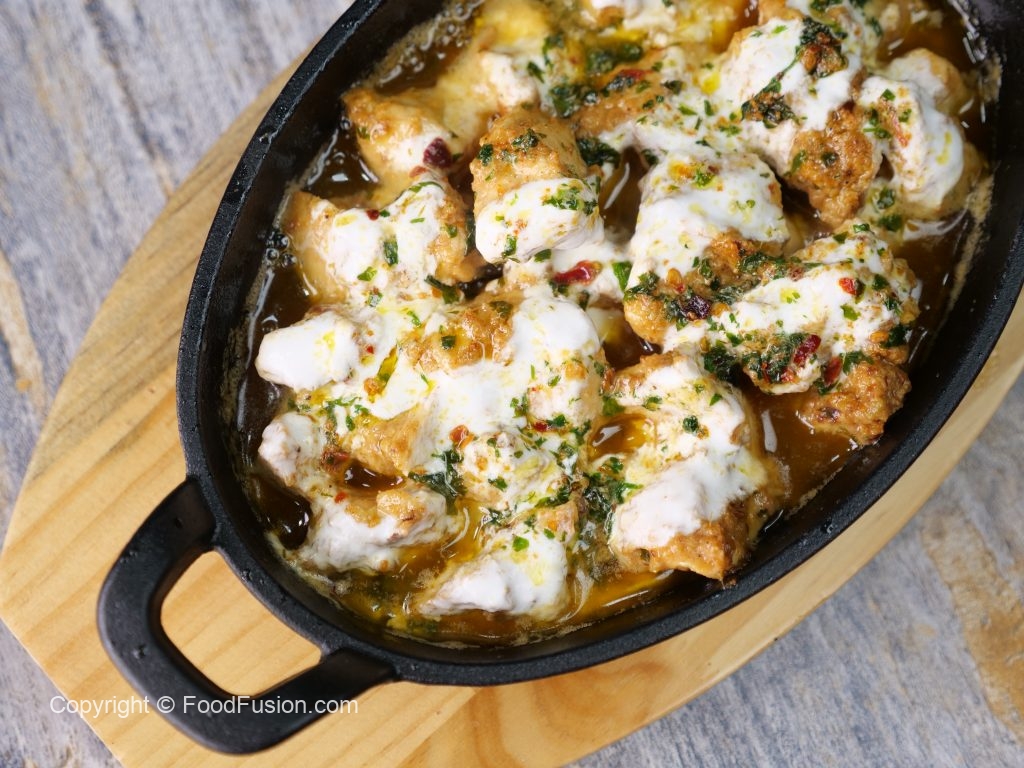 On heated sizzler pan,add chicken boti,pour yogurt,flavored butter & serve!