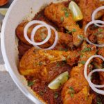 -Karahi mein cooking oil aur marinated drumsticks dal ker remaining marinade laga lein aur dhak ker halki ancch per 12-15 minutes kliya paka lein aur bech bech mein sides ko tturm ker lein aur remaining marinade laga lein ker dhak dein aur halki ancch per gul janay tak paka lein (12-15 minutes).