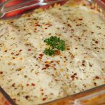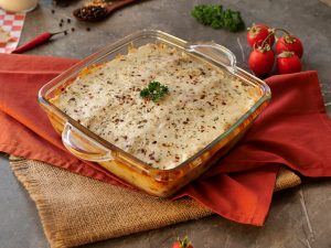 Lasagna sheets,red sauce,smoky chicken,white sauce,lasagna sheets,red sauce,cheddar cheese,mozzarella cheese dal dein,dried oregano aur lal mirch crushed chirak dein.