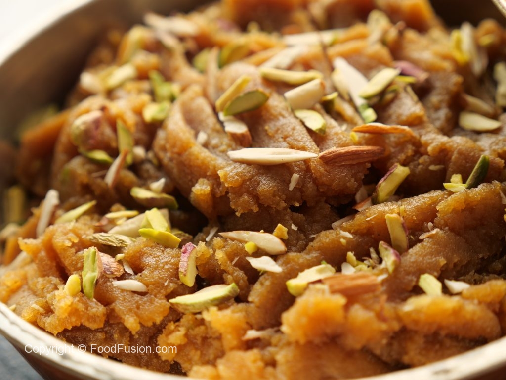 Add ghee (2 tbs at a time),mix well & cook on low flame until it changes color (12-15 minutes) and mix continuously.
